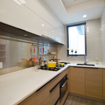 維景花園有是很多人都難以解決的問題,就是斜的客廳及斜的廚房,因此我們把客廳加上暗門櫃,令那視覺上可以一致及把空間好好分隔開,再在吊櫃下加上燈光,在彈琴昤有足夠的光源,而廚房再好好運用空間,能夠放置洗衣機及乾衣機,再把廚櫃好好設計,造出理想的家居。